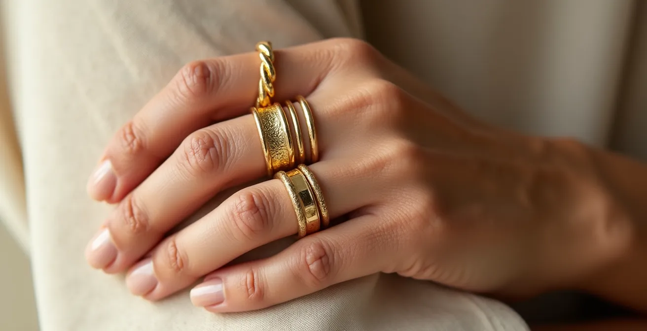 Además, cada movimiento de la mano provoca un micro-roce entre los anillos y la piel. A lo largo de miles de gestos diarios, esta fricción puede irritar la epidermis. El problema se agrava si los anillos no tienen un interior pulido o de tipo «comfort fit» (ligeramente abombado), ya que los bordes más afilados ejercen una presión más concentrada. La solución no es renunciar a tus combinaciones, sino adoptar un enfoque ergonómico.