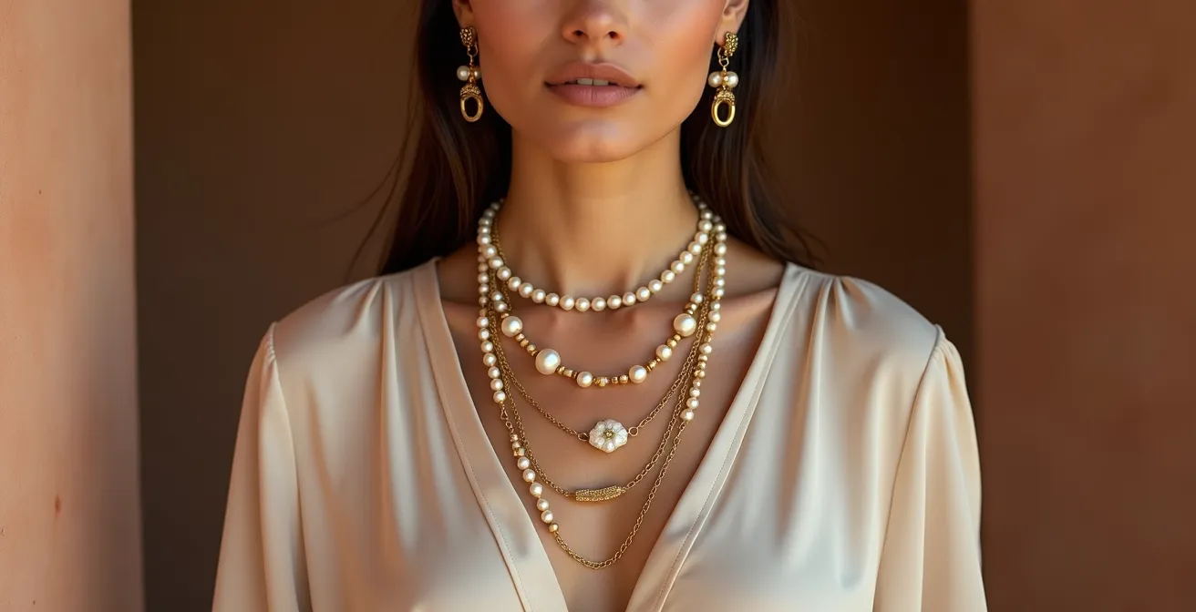 - Layering de collares: Combinar múltiples collares de diferentes largos y grosores para crear un volumen controlado y sofisticado en la zona del torso.
