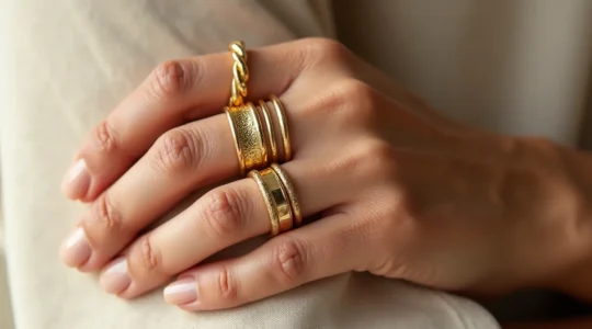 Llevar múltiples anillos simultáneamente plantea desafíos de comodidad. Los bordes internos deben estar perfectamente pulidos para evitar rozaduras. El grosor total acumulado no debería superar los 8-10 mm para mantener la funcionalidad de la mano. Para uso profesional intensivo (trabajar con ordenador, manipular objetos), considera oro de 14K o 18K en lugar de 24K: la aleación aporta dureza sin sacrificar demasiado el color. La plata esterlina (925), aunque más asequible, tiende a deformarse con el uso continuo cuando las bandas son muy finas.