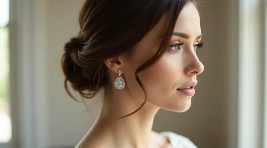 La sinergia entre el peinado y las piezas de joyería nupcial determina el equilibrio visual del conjunto. El dilema entre llevar el pelo suelto o recogido no es solo estético: condiciona qué piezas serán visibles y cuáles quedarán ocultas. Un recogido expone completamente los pendientes y el cuello, convirtiendo los aretes y el collar en protagonistas. El pelo suelto favorece piezas para el cabello (tiaras, peinetas, horquillas joya) y atenúa el impacto de los pendientes.